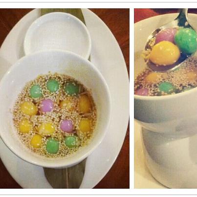They were an unusual texture - very doughy and the balls themselves were slightly sweet. The palm sugar syrup was very sweet but the strips of fresh ginger were refreshing and surprised me. The coconut milk was needed to balance out the sweetness and the sesame seeds added a nice crunch.